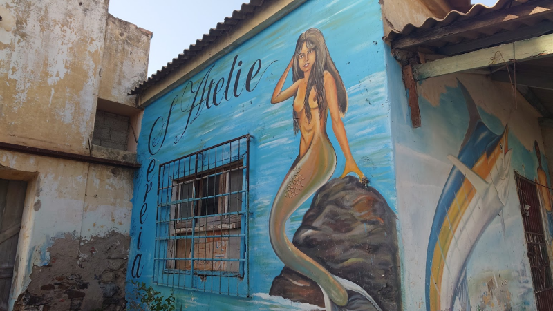 Lo primero que se ve al salir de la marina es este precioso mural de la reina de Cabo Verde, nacida en Mindelo, Cesárea Évora. Ya murió pero su música le sobrevive en todo el mundo. Aprendió a cantar en la calle,y estuvo siempre con los desamparados, llevó el nombre de Cabo Verde a todos los rincones del planeta, fue su mejor embajadora, "La diva de los pies descalzos", "La reina de la Morna". Iba descalza para no olvidar nunca su origen, y recordar al mundo de los escenarios que hay mucha gente todavía sin dinero para zapatos.