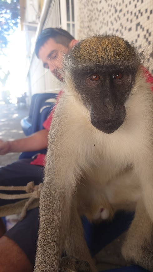 Y nos tomamos un zumo con un macaco colorado y su dueño rastafari a quien invitamos a un zumo. El mono ha sido sometido, el dueño rastafari consigió dominar su agresividad, lo lleva atado, como a un perro. Te coge la mano y te la pone en la espalda para que le rasques. Se toma una naranja con nosotros. Vas a tener una vida diferente, hermano mono.