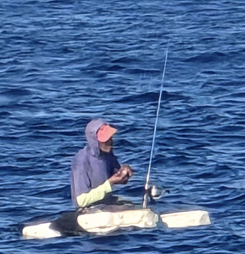 Pero Cuba no va a dejar de sorprender hasta el último segundo. Qué alguien me explique las siguientes fotos. A media milla de la bocana, hay unos pescadores inverosímiles. Alguno parece que está sentado en unos trozos de poliespan. No lo puedo entender, están sentados en el agua. No tienen remos, no tienen nada, no parece que estén mojados, están pescando con caña.