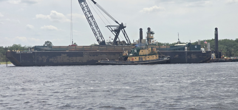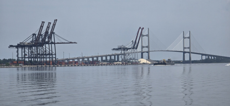 En la entrada está May Port, puerto de la Armada estadounidense. Se ven los cañones. Los remolcadores suben y bajan, porque se está dragando el río permanentemente, para que los mercantes puedan entrar sin problema. Hay una estación de intercambio y carga de contenedores.