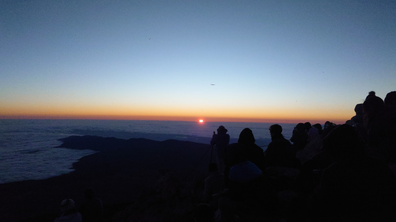 El suelo de lava es bastante duro a pesar de la esterilla, me concentro en las posiciones para poder dormir. La almohada es lo peor, la hago con el cortavientos pero no es top. Duermo de 45 minutos en 45 minutos. A las 5.00 arriba, me acerco al teleférico, ya hay grupos de jóvenes que han subido, alguno con el mar de altura, hablo con algunos. A las 6.00h nos ponemos a subir con linternas, voy bien, he podido descansar.